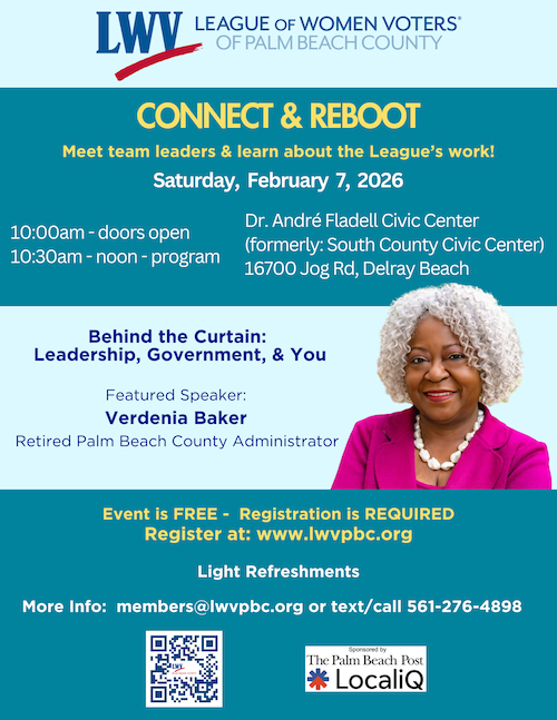 Note: Photographs will be taken at events for use on the League of Women Voters of Palm Beach County website, marketing materials, "the Voter" Newsletter, and in the press. By attending an event you consent to being photographed and your image and likeness being used by the League of Women Voters of Palm Beach County.
