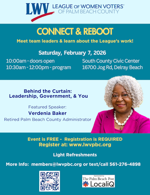 Note: Photographs will be taken at events for use on the League of Women Voters of Palm Beach County website, marketing materials, "the Voter" Newsletter, and in the press. By attending an event you consent to being photographed and your image and likeness being used by the League of Women Voters of Palm Beach County.